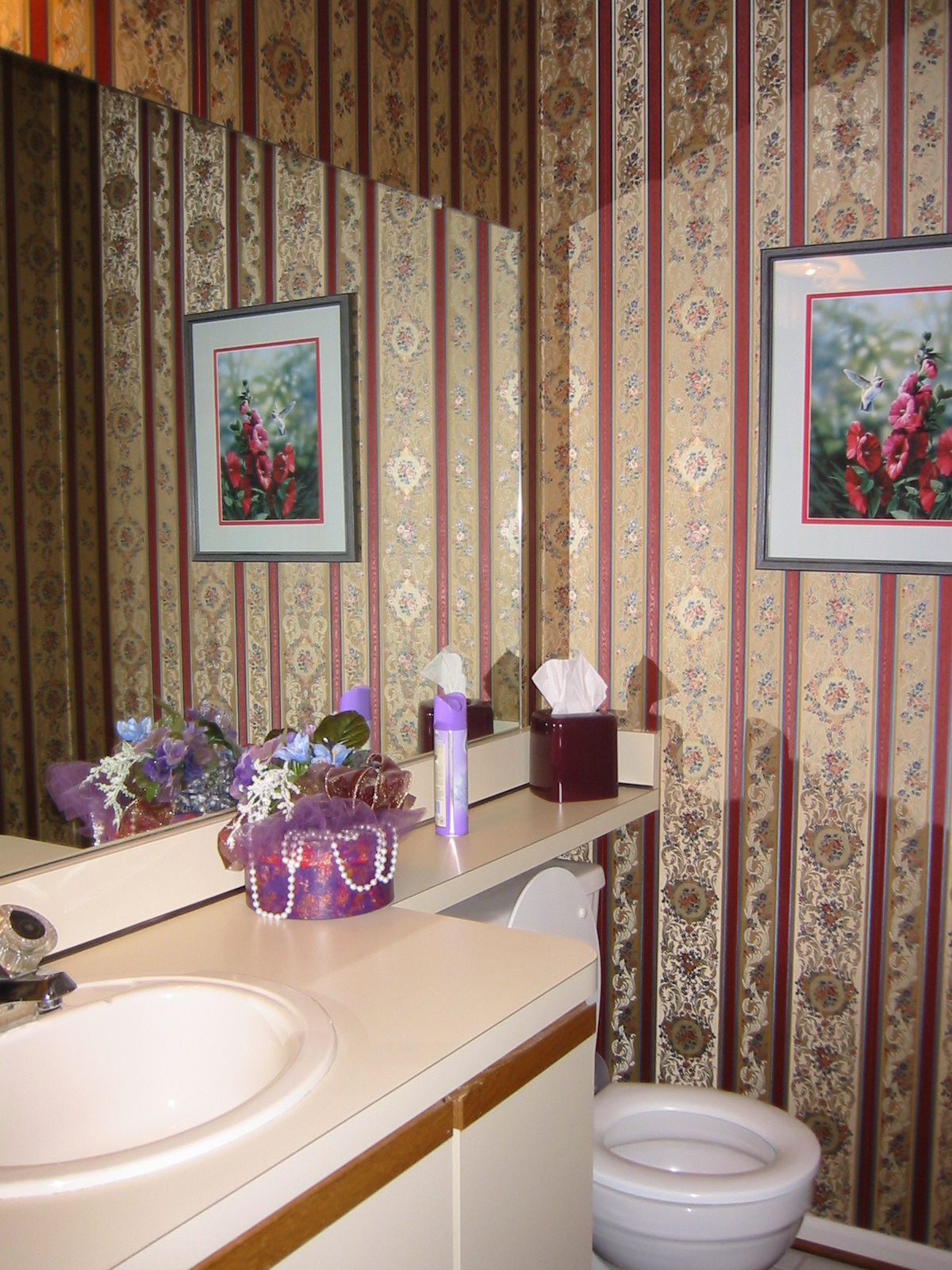Besides removing the wallpaper, I removed the dated builders mirror and vanity and replaced it with a Kohler pedestal sink and antique mirror. To keep costs down I kept the toilet and the floor tile.