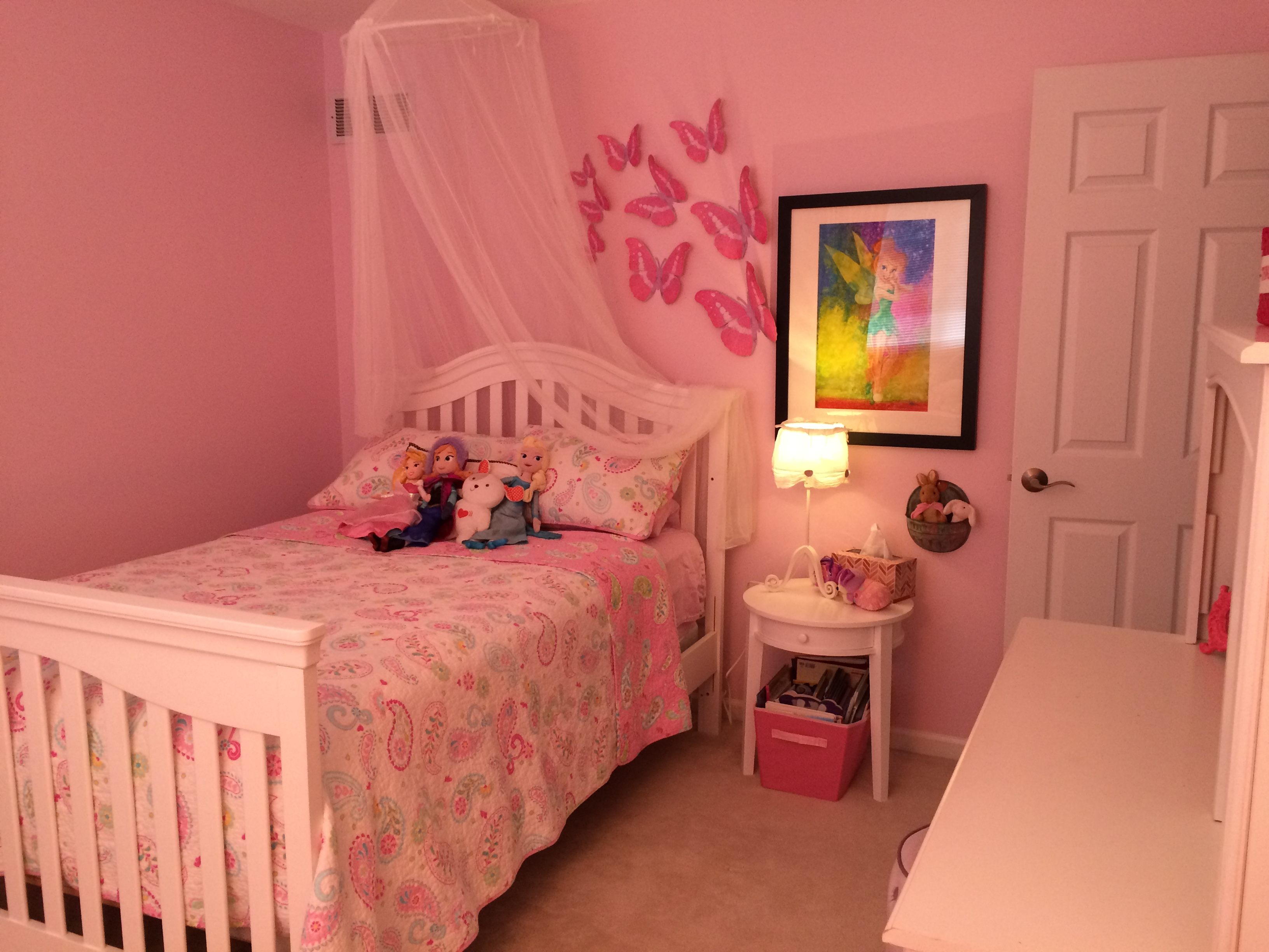 My client is a big Disney fan, and so the parents invested in a lithograph of Tinker Bell that hangs prominently nest to the bed by the door welcoming her imagination to flourish.