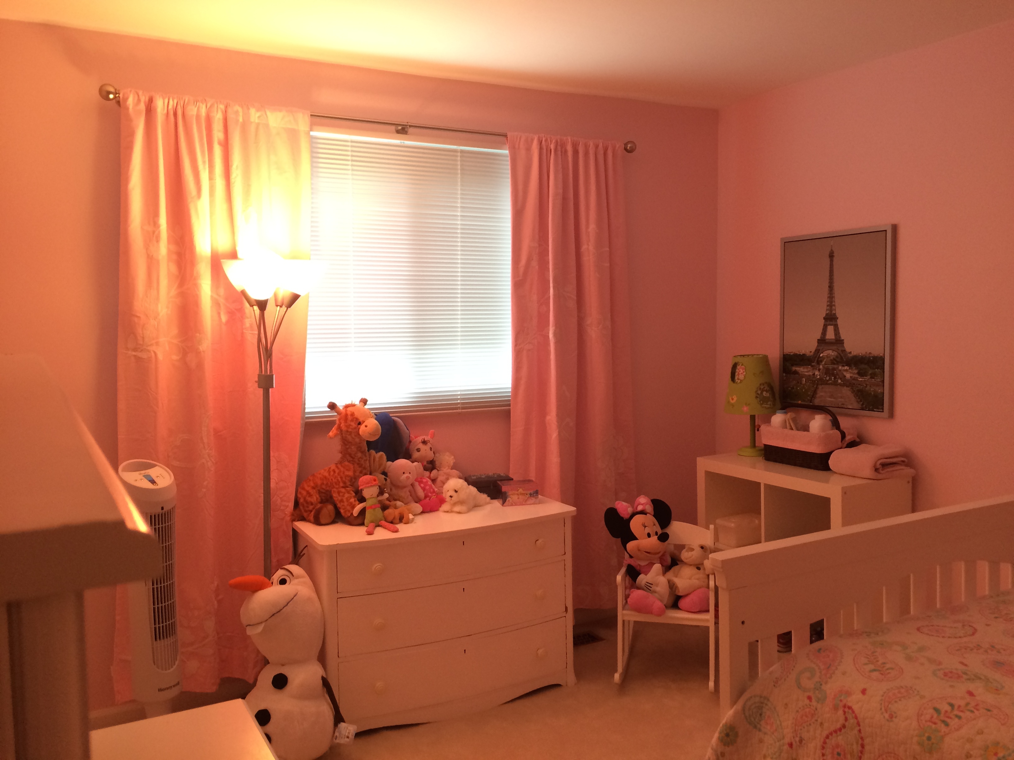 The antique white dresser, desk and bed frame are the foundation and will transition well as she grows and matures and her tastes change.