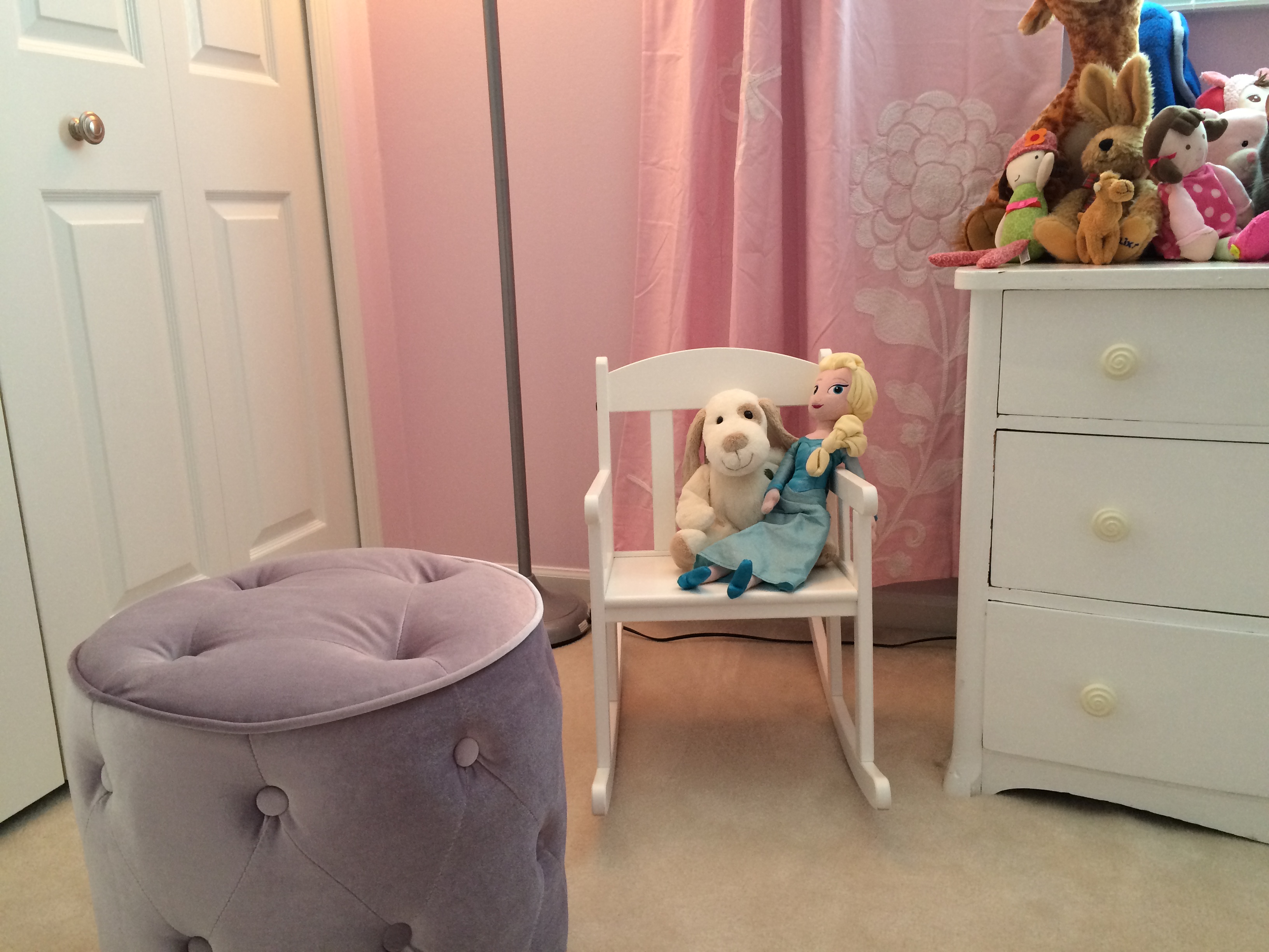 I added a seating area for her friends that come over and play… including a rocking chair and purple poof to sit on… for reading books or hanging out. Pink drapes with embroidered flowers and butterflies frame the large window.
