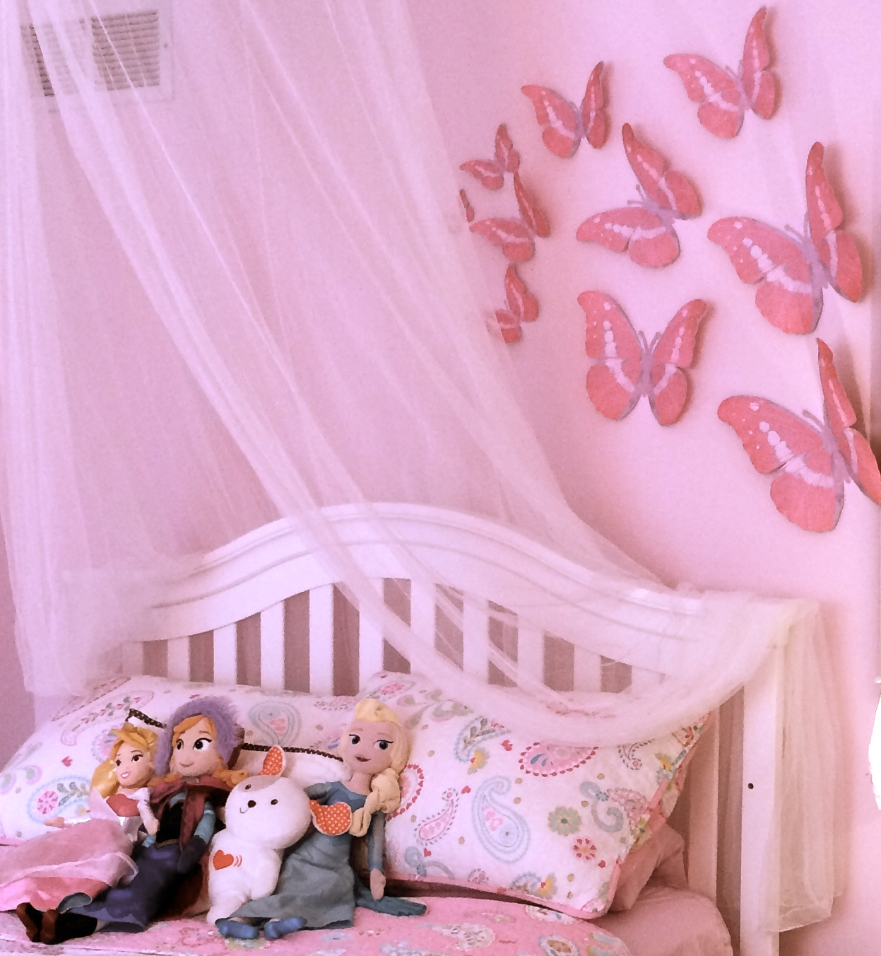 The whimsy part of the project were the butterflies I was inspired to add on the wall over the headboard delicately masked by an ‘Elsa Castle’ inspired mosquito netting that she takes refuge in surrounding herself in it curled up with a book.