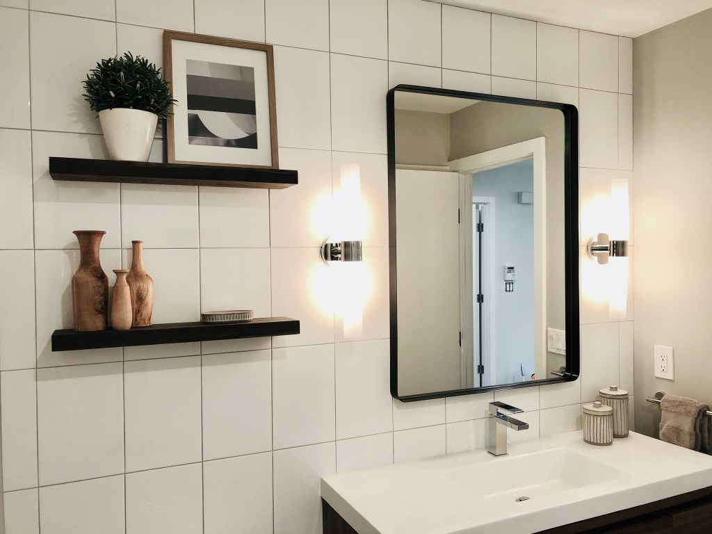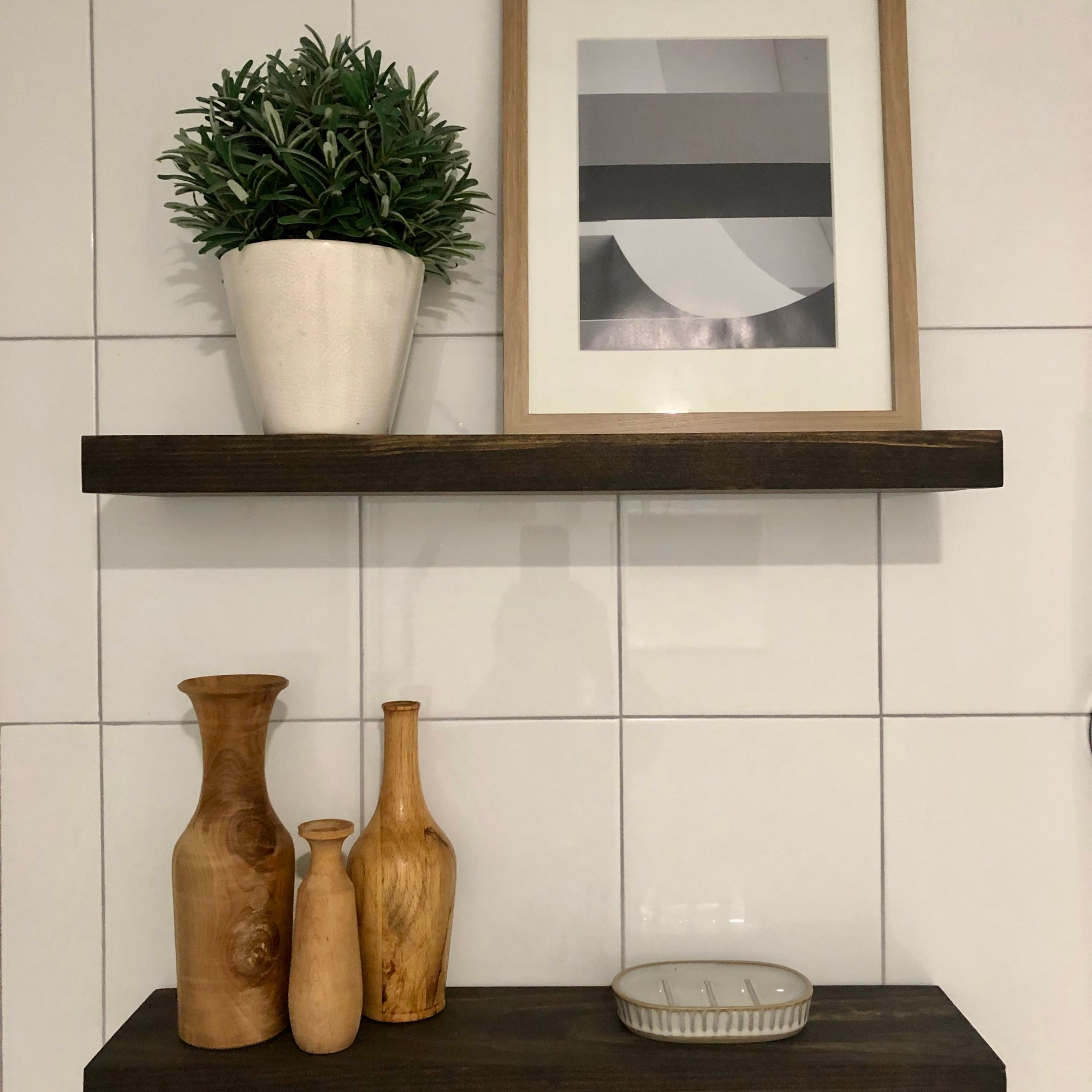This theme is carried into the shower with hex tiles in white in the niche. Floating shelves over the toilet finish the look with plants and photos that make the space inviting.