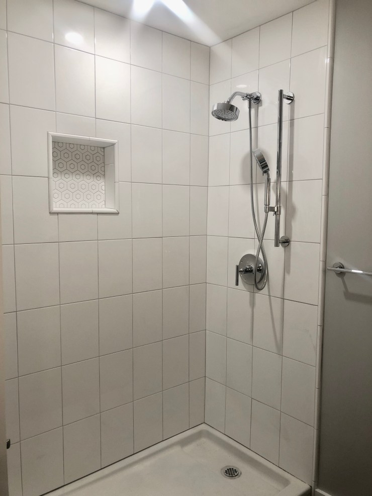 This guest/hall full bathroom achieved a modern approach by opening up the space by removing the soffit from the bath/shower 1-piece unit, creating a walk-in shower with a full-size shower pan with limited walkover height.